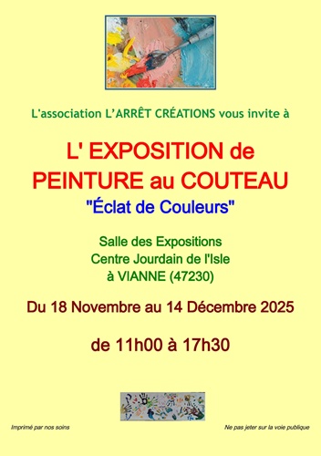 Isabelle GELI expose ses œuvres dans le cadre de l'association "l'Arrêt création" à l'exposition de Peinture au couteau "Éclats de Couleurs" du 17 novembre au 14 décembre 2025 à la salle des expositions de Vianne (47).