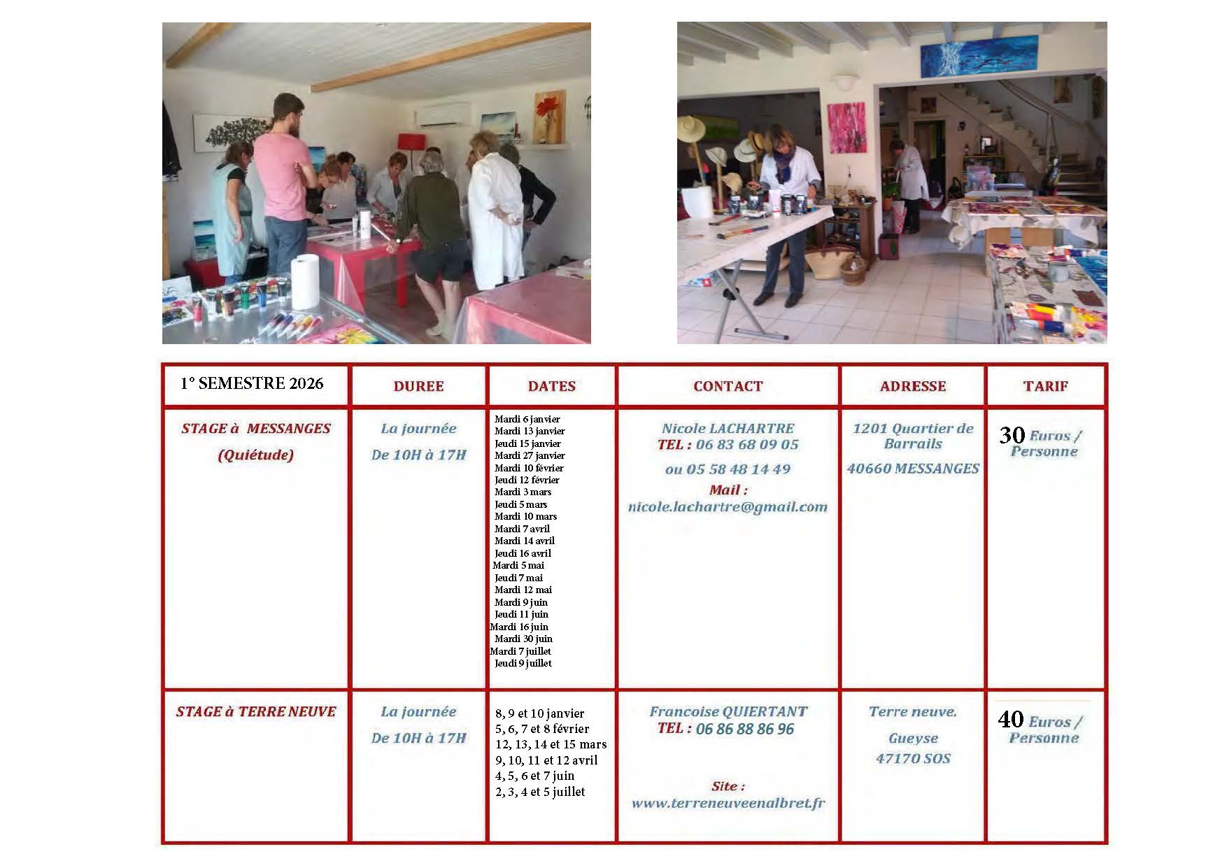 Les plannings des ateliers pour le premier semestre 2026 sur les sites de "Terre neuve" à GUEYZE et de "Quiétude" à Messanges sont disponibles dans la section cours et ateliers.